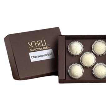 Die preisgekrönten Champagnertrüffel von Schell Schokoladen sind eine Spezialität der Manufaktur aus Gundelsheim. Für die Trüffelcremefüllung wird echter Champagner verwendet, kombiniert mit ausgewählten Kakaosorten, frischer Sahne und dunkler Schokolade. Das Ergebnis ist eine Füllung, die sowohl aromatische Frische als auch feine Kakaotiefe besitzt. Die Trüffel verbinden sanfte Brioche-Anklänge mit einer cremigen, leicht fruchtigen Süße – ein Profil, das hervorragend zu klassischen Brut-Champagnern passt.